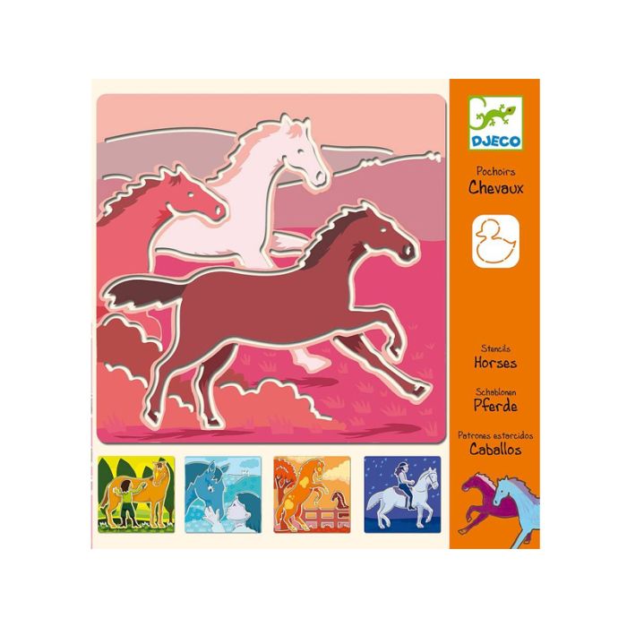 Djeco Schablonen Pferde. Kreativset von Djeco mit fünf Schablonen mit unterschiedlichen Pferde-Motiven. Damit können Kinder ihrer Kreativität freien Lauf lassen und bunte Bilder malen. Einfach die Schablonen auf Papier legen, den Konturen mit Stiften folgen und später alles ausmalen. Geeignet für Kinder zwischen 6 Jahren und 11 Jahren. Größe der Packung: 23 x 21 cm. Achtung! Nicht für Kinder unter drei Jahren geeignet.
