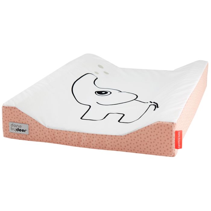 Done by Deer Wickelauflage Elphee rosa. Elefant Elphee leistet Dir Gesellschaft während Mama oder Papa Deine Windel wechseln oder Dich anziehen. Die Anti-Rutsch-Wickelauflage ist aus acrylbeschichteter Baumwolle ohne PVC. Die Füllung ist aus Polyesterschaum. Größe: 50 x 65 cm. Reinigung: der Reißverschluß der Hülle läßt sich öffnen und der Bezug ist waschbar bei 30° C (nicht für den Trockner geeignet).